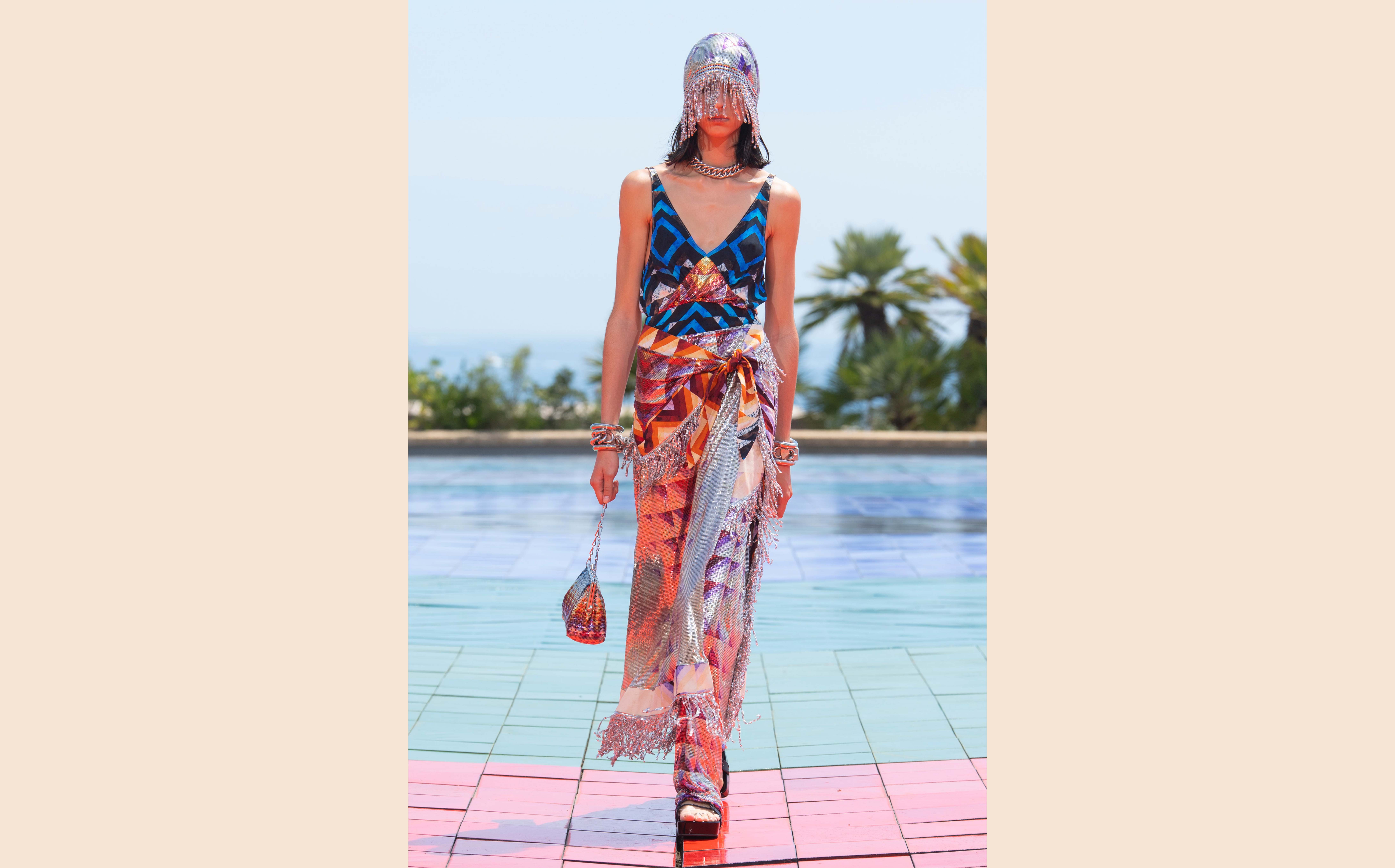 Casablanca – my new favourite brand – went for a Japanese-inspired collection. Sticking to their quintessential pastel tones, the collection had a late 60’s, early 70’s feel to it, with mini-skirt co-ords and scalloped mini-dresses with O-rings. Of course, they have their silk shirts – a staple for the brand – but the highlight of the collection was the butterfly skirt with matching halter top.